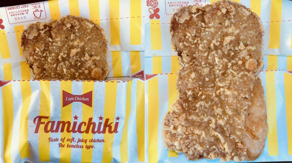 見た目は一見普通のファミチキですが、よく見ると、黒い葉っぱ状ものが衣に付いています🙂(多分ネギ❓)
